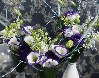 Finally add the blue coloured Betula twigs and the Lisianthus to fill the cone. I used purple and white single and doubles and two coloured white/purple varieties. Now your arrangement is ready for the vase.